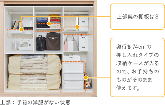 奥行きのある収納グッズや前後使いで収納します。