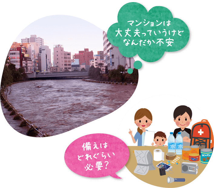 最近、大雨による被害があちこちで起こっています。大型台風やゲリラ豪雨も増えているしニュースを見ると怖くなります。マンションは頑丈だと思うけど、どういう点に気を付けて備えたらいいですか?