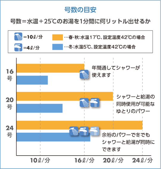給湯器には給湯能力の大小を表す「号数」があります。同じ号数の機器でも、使うお湯の量が増えれば給湯器にかかる負担は増大します。人数に適した号数の給湯器を選ぶことが大切です。