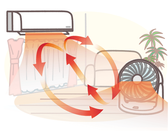 エアコンなどで部屋を暖める際、厚手のカーテンや断熱シートを用いて窓からの冷気を防ぐのがポイント。空気は暖かいほうから冷たいほうへ流れるので、冬は断熱シートは室内側に貼りましょう。また、冷気は床のほう(下)にたまるので、カーテンを床面まで届く長さにしたり、サーキュレーターで天井のほうにたまった暖気を撹拌して部屋を暖かくするのがおすすめです。また湿度が高いと体感温度が上がるので、無給水加湿機能があるエアコンは有効ですよ。