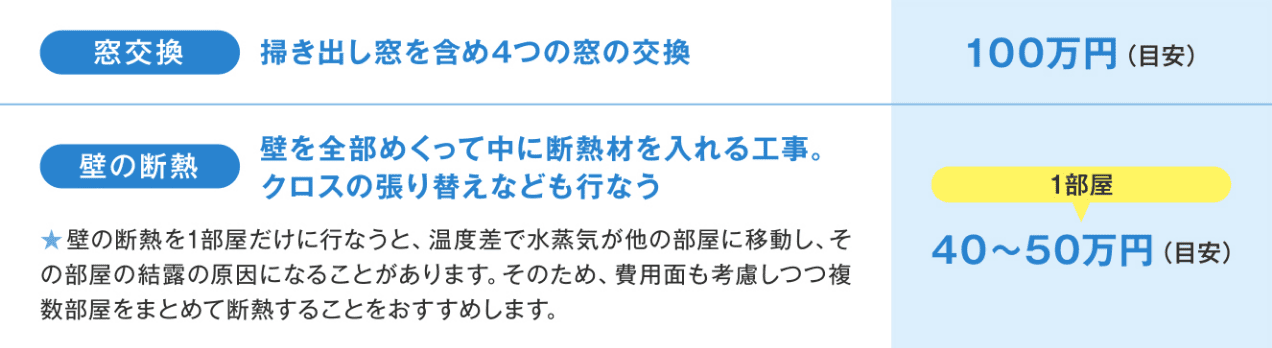 壁にカビができていてそれごとリフォームしたい、間取り変更を伴う大規模リフォームを考えているといった場合は、壁の断熱工事も行なうと結露の改善が見込めます。