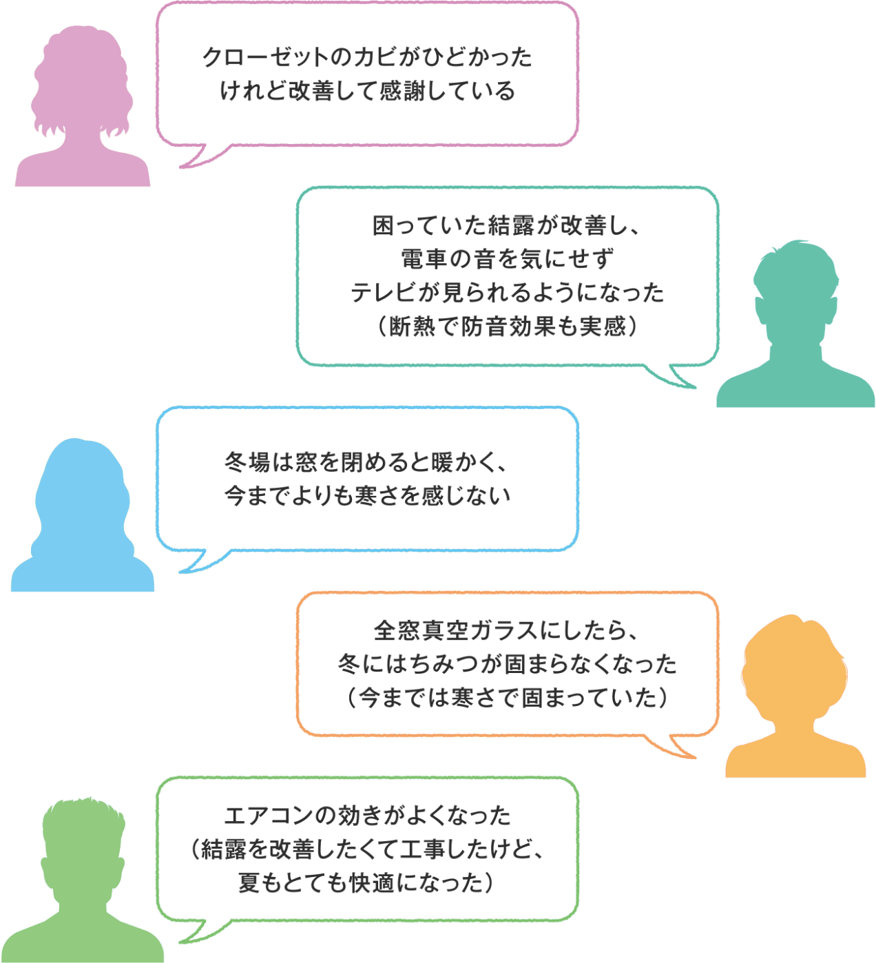 いかがですか? 結露の相談を受けると、一般的には窓のリフォームが提案されがちですが、長谷工リフォームではまず結露の原因について、お住まいを拝見したうえでアドバイスし、見直すところからスタート。その後に、必要に応じて窓のリフォームをご提案します。腰窓に内窓設置なら補助金も活用でき、工事は1日で完了。たとえば、お子さまが巣立ったご夫婦のライフスタイルにフィットする間取り変更や壁の断熱工事も含めた本格リフォームもプランニングいたします。プロの視点から「住まい方と結露対策」の効果的な方法をご提案しますので、ぜひご相談ください!
