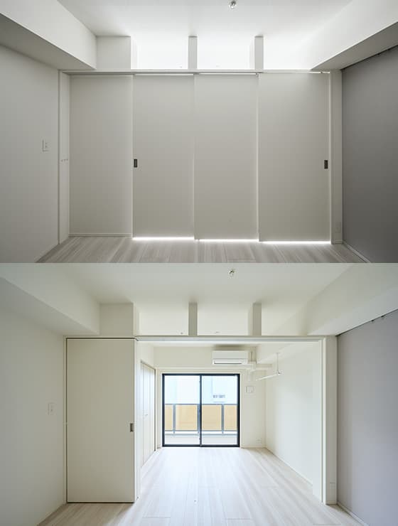 - 引き戸を開放することで約10畳のリビングスペースに。