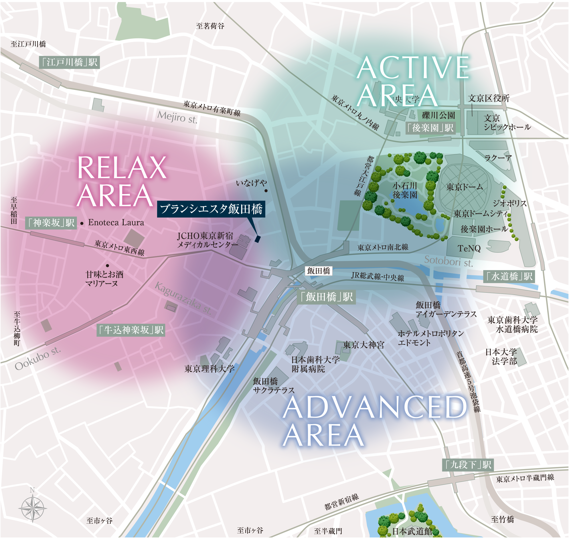 新宿・千代田・文京の3つの区境が接している交通の要衝、都心のにぎわいを感じるエリアにありながら「ブランシエスタ飯田橋」は大通りの喧騒から一歩離れており、日々の暮らしで静寂が保たれます。