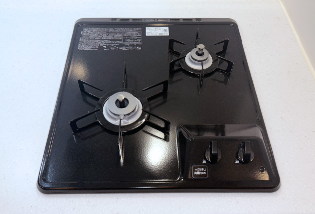 斜め配置で使いやすい2口コンロを設置。作業スペースも広く確保できるので、効率的に料理をすることができます。