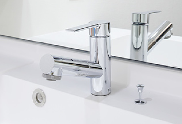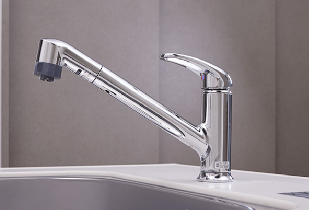 ホースが引出可能で使い勝手にすぐれ、デザインも美しいシングルレバータイプの水栓を採用しています。ホースが引き出せるので、シンクのお手入れにも便利です。