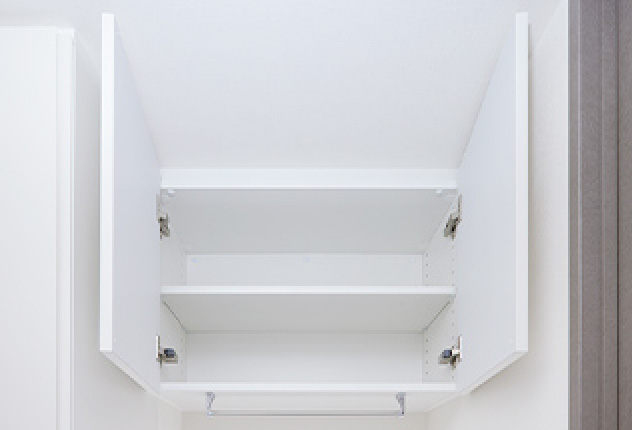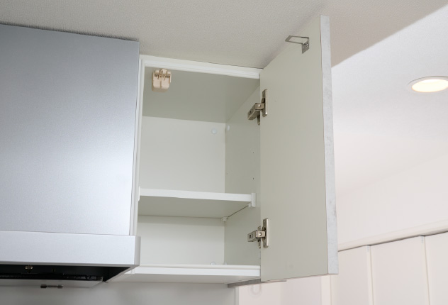 キッチンの上部に吊戸棚を設置。地震の際に食器類の飛び出しを防ぐ、耐震ラッチ付きです。