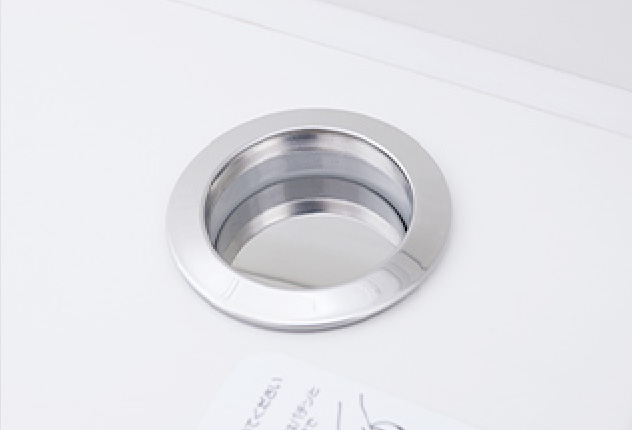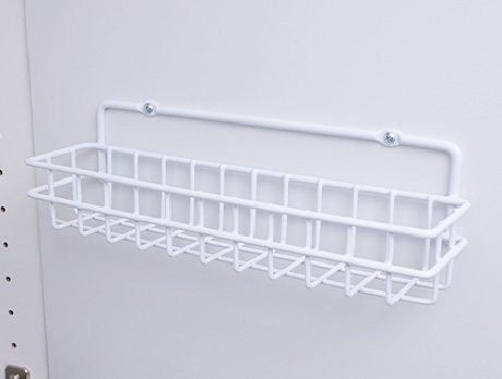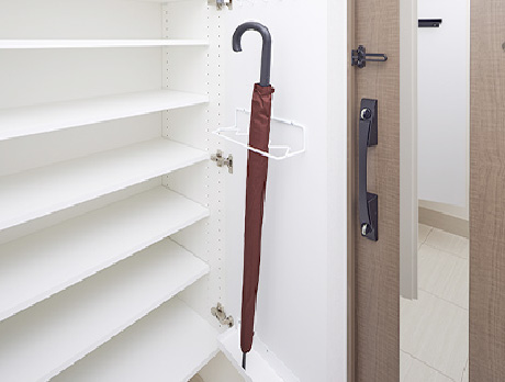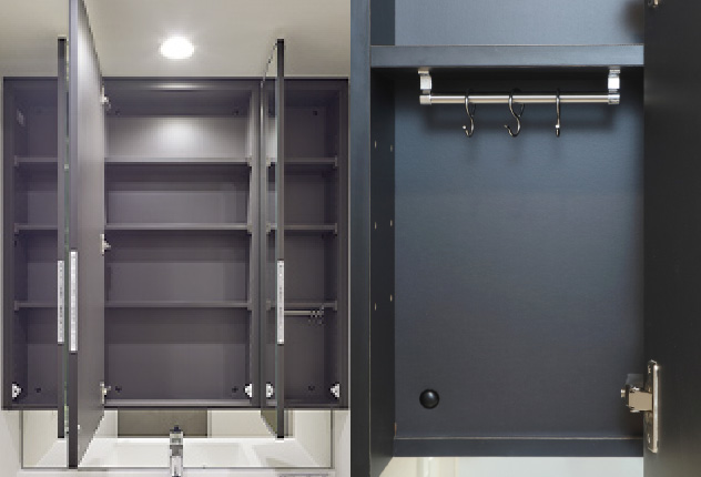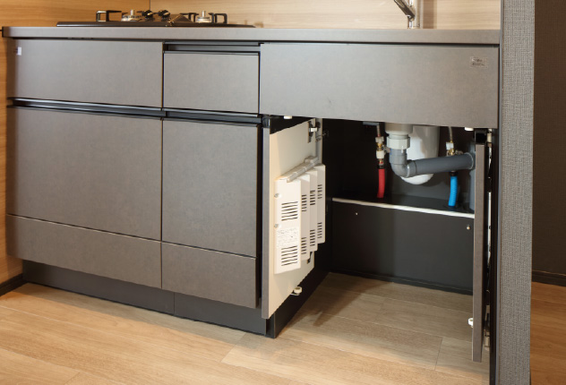 スライドインできる収納扉を採用し、中にはコンセントも設置。充電式機器やゴミ箱の置き場としても活用できます。