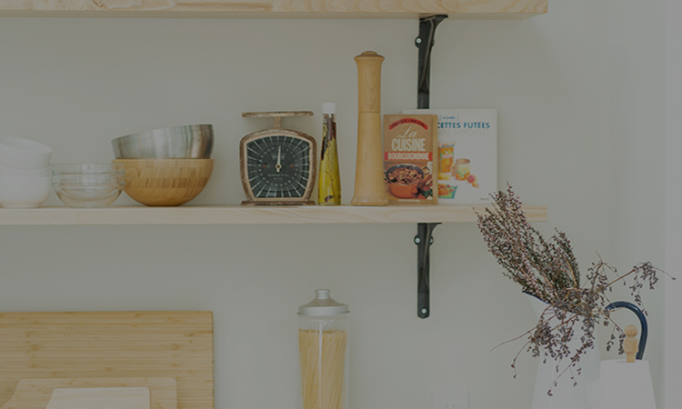 キッチンの上部に吊戸棚を設置。地震の際に食器類の飛び出しを防ぐ、耐震ラッチ付きです。