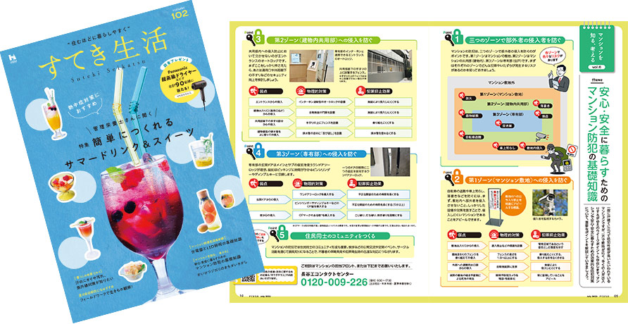 管理マンションの様々な活動や居住者の皆さまのマンションライフに役立つ情報を満載した生活情報誌「素敵生活」を年4回発行して、管理マンションにお住まいの皆さまにお配りしています。