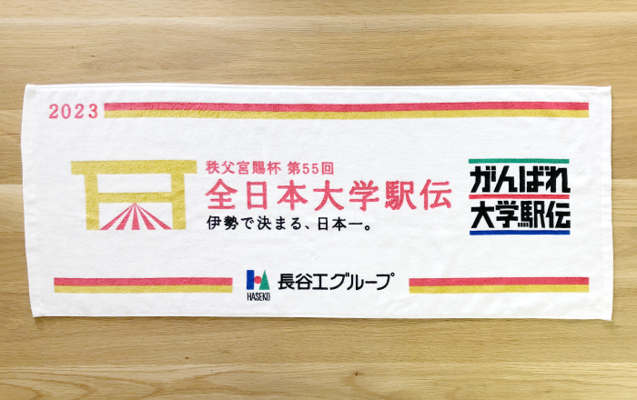 出場チームに差し入れし、好評をいただいている、長谷工オリジナル駅伝応援ラベルのミネラルウォーターです。選手に長谷工からのエールの言葉を少しでも届けたく、ラベルにメッセージを入れました。環境に配慮したボトルで、地区別、本大会出場校別など計34種類あります(非売品)。
