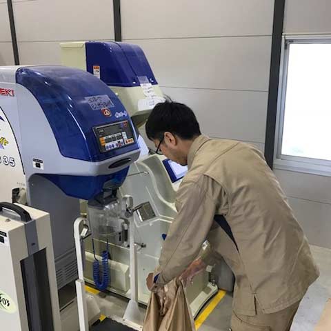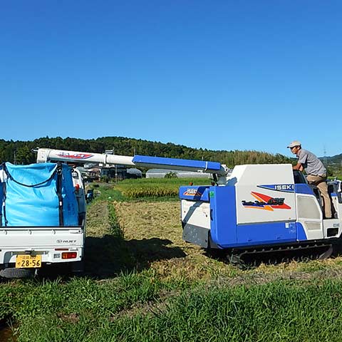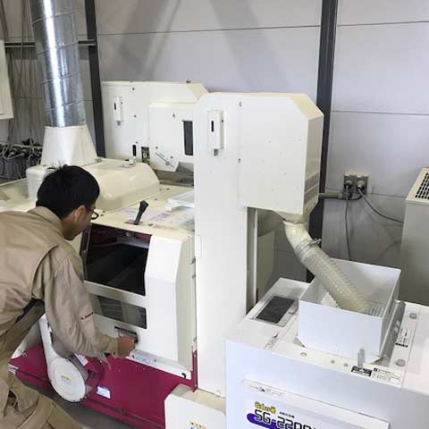 収穫されたお米は直ちに乾燥調整プラントに持ち込み、生の籾を乾燥します。乾燥した籾は、籾摺り機で、外の皮を剥ぎ玄米にし、籾摺り⇒石抜き(1.8㎜目での選別)⇒色彩選別機⇒計量選別機(1.9㎜目での選別して計量)の順に玄米にします。乾燥した玄米はいつでもフレッシュな状態で出荷できるように低温保管室にて保管されます。