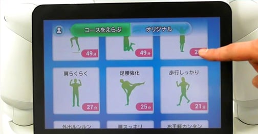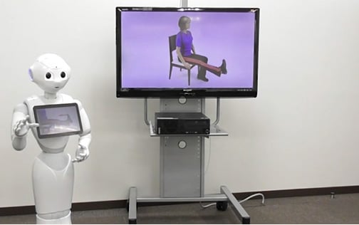 - テレビなどのモニターと接続させて連携することが可能。Pepperが苦手な足の動き等の模範をわかりやすく動画や画像でお伝え。モニター連携なしでも、Pepperのタブレットで体操のポイントをお伝え。