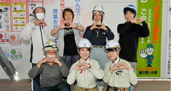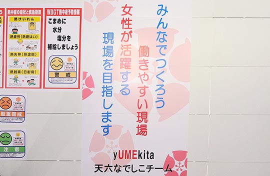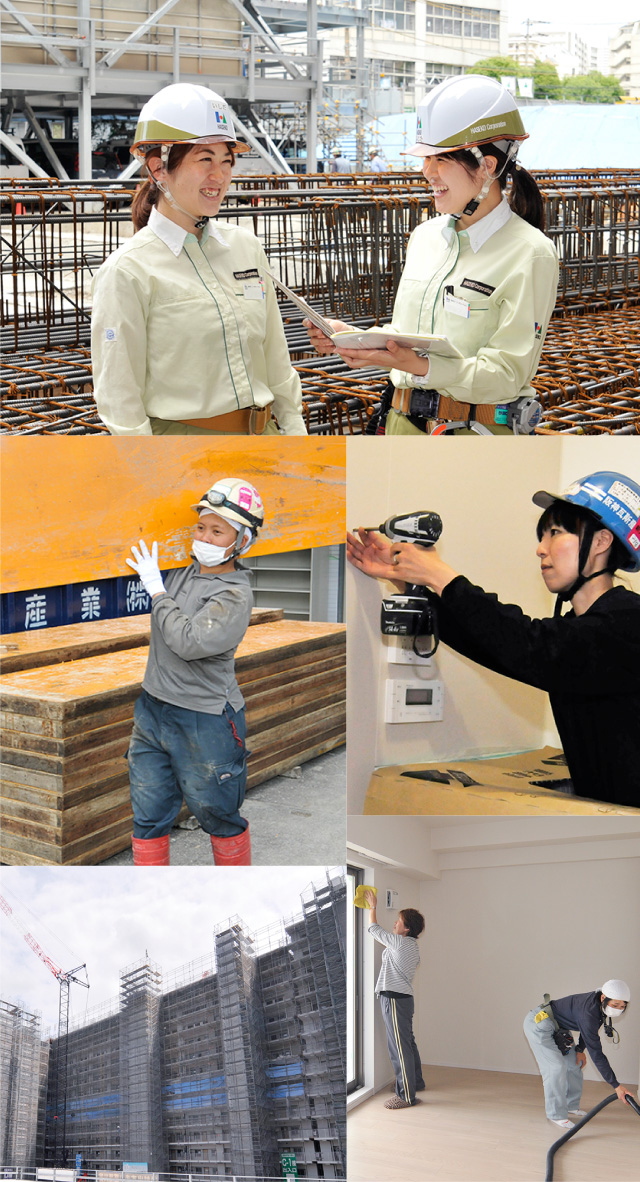 躯体、仕上げなど建設現場のいろいろな場面で女性が活躍中です。女性ならではの視点やこだわりを、より良い職場環境やマンションづくりに活かしていきたいと思っています。女性専用トイレや更衣室なども快適にくつろげることに重点をおいて整備しました。女性メンバーのみんなが、いい雰囲気で仕事に励んでいます。