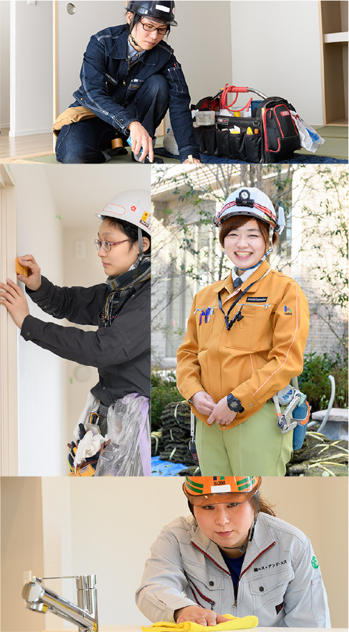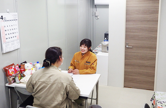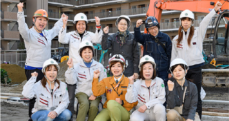 トイレ、休憩所、更衣室など女性専用施設を完備しています。女性メンバー同士の交流や意見交換会でコミュニケーションを深め、女性ならではの目線による場内整備、美化を行っています。竣工まで、女性だけでなく、現場のみんなが気持ち良く働ける環境を整えていきます。私たちが「美しい現場、長谷工」を見える化していきます。