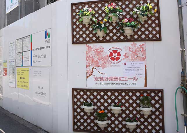 地上10〜15階×4棟構成という大きな現場のため、スケールメリットを生かした現場運営を行っています。また、JR神戸線に近接していることから、毎日欠かさず飛散物パトロールを実施しています。女性が働きやすい環境整備として、けんせつ小町の懸垂幕や看板を取り付けたり、女性だけでなく男性も気持ちよく働けるよう、花壇をつくったり、会議室や詰所の整備、清掃も積極的に行っています。現場内の看板はオリジナルで、目に留まるように工夫しています。