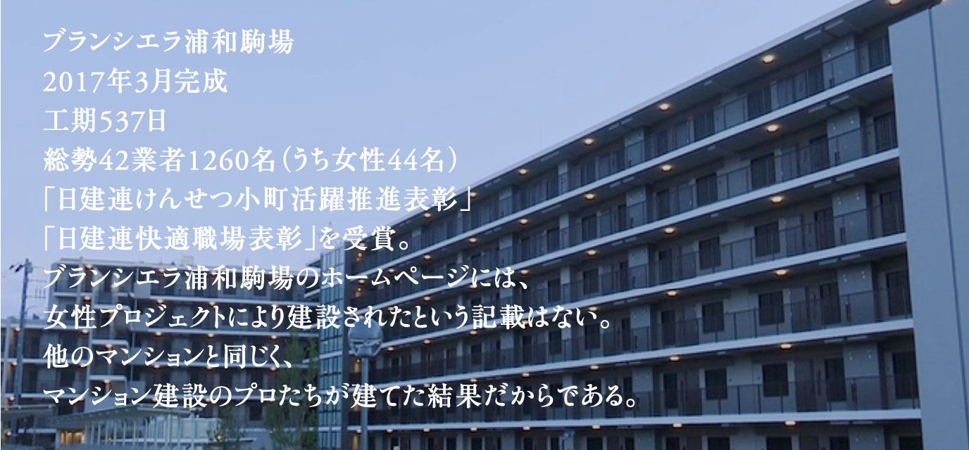 それが、2016年1月に施工を開始する「ブランシエラ浦和駒場計画」だった。約5800㎡の敷地に7階建て146戸のマンション規模を「女性の管理者で建設する」と発表したのだ。施工現場だけではない。事業企画、開発推進、設計、施工、インテリア内装、販売、管理…つまりマンション計画から販売、その後の管理まで、「ブランシエラ浦和駒場計画」ではすべての部門で女性を起用するという大胆な構想だったのである。