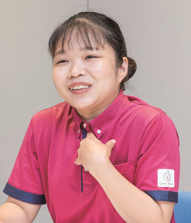 グエン 私は「ブランシエール大宮公園」でご入居者様の生活をサポートしています。具体的には食事や入浴、排泄などの介助です。仕事で大変なのは日本語を覚えることで、一緒に働いているスタッフから仕事の専門用語などを教えてもらいますが、ときどき入居者の方からも日常生活で使う日本語を教えてもらいます。職場では皆とてもいい関係を築いています。