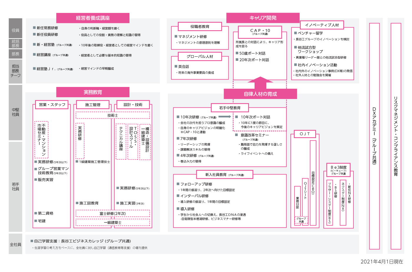 - 自らの実務遂行能力の向上や将来に向けた知識・スキル習得の為、全社・全社員に自己学習の場「長谷工ビジネスカレッジ」を提供しています。