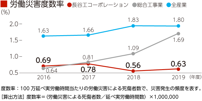 長谷工グループでは、「グループ安全衛生管理方針」によりグループ社員の安全衛生に関する方針を年度ごとに定め、労災事故撲滅のための取り組みを徹底するとともに安全で快適な職場づくりに継続して取り組んでいます。
