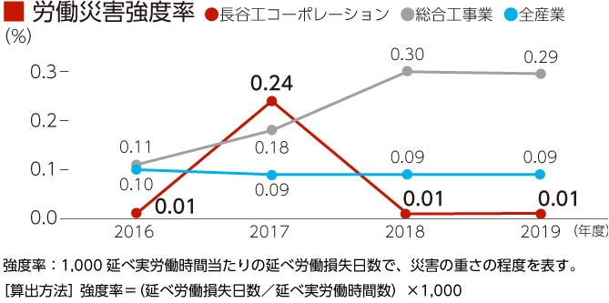労災事故撲滅に向けては、建設作業所における災害数値目標として「労働災害度数率0.60以下」、「労働災害強度率0.01以下」※を掲げて活動しています。安全で快適な職場環境づくりに向けては、建設作業所における「働き方改革」の一環として一層の休日取得促進を図り、作業員も含めた長時間労働の改善に努めました。さらに「MOSt(モス)活動」とも連携し、グループ全体で組織的に取り組みました。