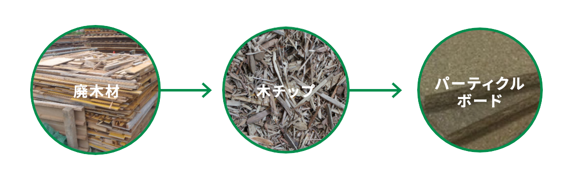 建設作業所から発生した木くずは、再資源化施設に持ち込み、パーティクルボードに再生されます。再生されたパーティクルボードは、再び建設現場で使用する循環型マテリアルリサイクルを行っています。原木からの製造過程に比べCO2の削減、また森林の保護にもつながる等、環境負荷の低減を図っております。