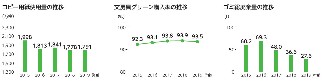 2024年度のコピー用紙使用量は857万枚でした。前年度との比較では99万枚(10.3%)の減となりました。今後も両面コピー、2UP以上コピー、裏紙使用、会議資料削減を推進し、紙資源の有効利用を図っていきます。