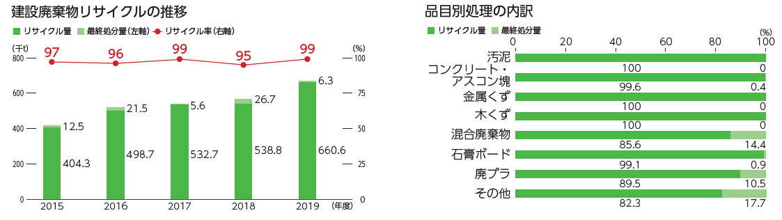 循環型社会形成に向けて、建設廃棄物の分別・リサイクルや省梱包、廃材の発生を抑える工法の採用などを通じて、建設廃棄物の削減に努めています。