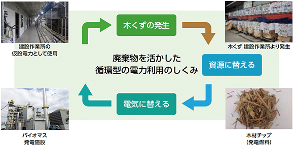 外部の発電事業者と連携して、建設作業所で発生した木くずを燃料の一部にしたバイオマス発電による再生可能エネルギーを、建設作業所の仮設電力として使用する資源循環の取り組みを導入しています。
