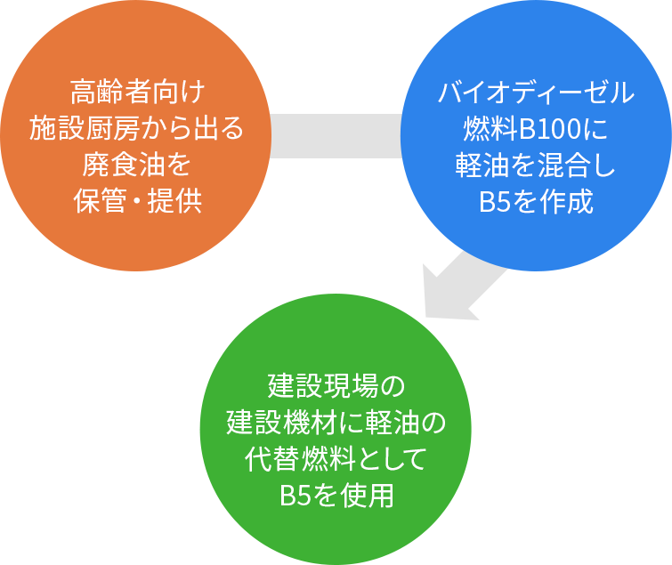 長谷工シニアウェルデザインが運営する高齢者向け施設の厨房から排出される廃食油について、三和エナジーがバイオディーゼル燃料(B5)※に精製して建設現場の建設機材に使用する軽油の代替燃料として供給する「廃食油活用システム」を構築しました。