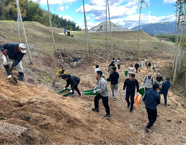 「明日香村プロジェクト」を推進する奈良県明日香村において、2023年度より生物多様性保全活動をスタートしました。第2回目となる2024年度は11月に開催し、長谷工グループ社員37名が参加し、牽牛子塚古墳周辺で紅葉の植樹・竹チップ散布・草刈りなどを行いました。今後も明日香村での生物多様性保全活動を継続し、明日香村の地域活性のためにも様々な活動に取り組んでいきます。