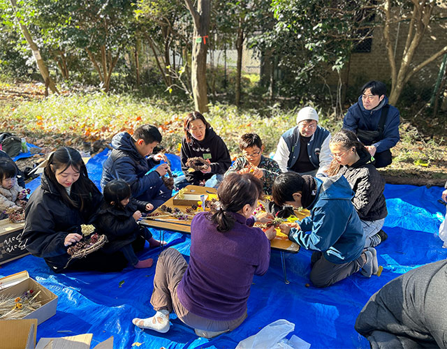 2024年度は11月に長谷工グループとして12回目となる緑地保全活動を行いました。長谷工グループ社員及びその家族40名が参加し、東京都環境局とNPO法人自然環境アカデミー、清瀬の自然を守る会の協力のもと、自然観察を通じて自然や生物多様性について学んだ後、草・笹刈り、除伐・落枝整理、落ち葉や木の実を使ってのクリスマスリースづくりを行いました。