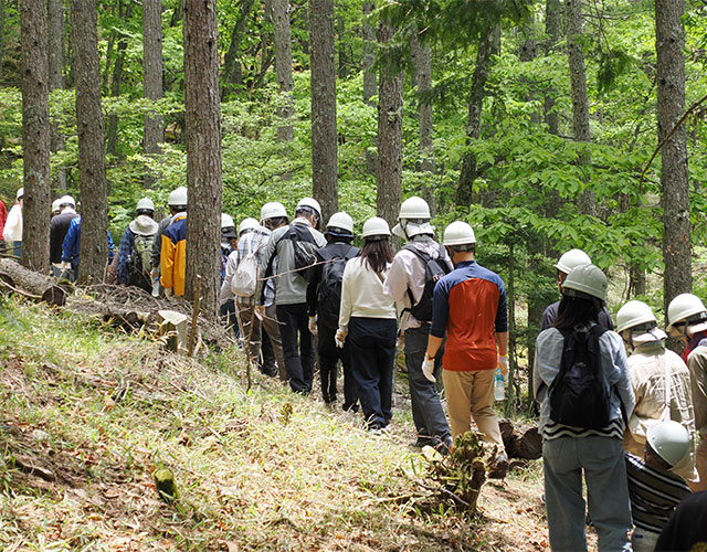 - 森林は、葉が茂りすぎると地面まで陽の光が届かず、細い木が乱立したり土地がやせてしまう場所も出てきます。そうしたエリアでは雨が降っても適切に水を吸収せず、土砂崩れを起こす危険もあります。まずは里親となったエリアを間伐したり、下草を刈ったり整備することで、生命力あふれる森林環境を取り戻すことからはじめていきます。