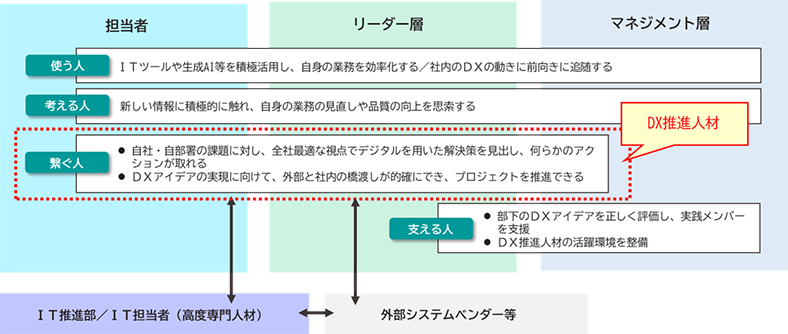 DX具現化のためには、「全社員」がDXに前向きであり、一部の「高度専門人材」の知見と「DX推進人材」の変革への推進力が必要になるとし、人材像を3人格に分けて定義しています。