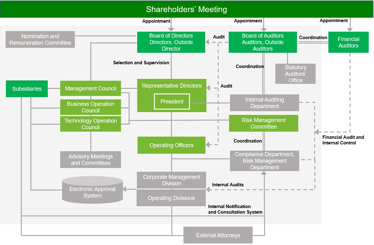Moreover, decision-making on certain matters authorized by the Board of Directors is made at the Management Council and two operation councils – the Business Operation Council and the Technology Operation Council – to which participation of the Directors are limited to a certain level. By doing so, the functions of making decisions and supervising such decision-making are divided. The system allows each Director to supervise the execution of duties by other Directors.