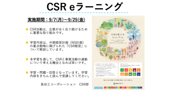 In fiscal 2022, we conducted e-learning for all Group officers and employees and distributed to employees our CSR Handbook, which provides a useful summary of the Group’s CSR activities, to promote and deepen their understanding.In addition, CSR lecture presentation was held on the theme “CSR management required of companies” targeting for Management Executives, by inviting Mr. Sakuramoto, Executive ESG Analyst of the asset management firm, Asset Management One CO.,Ltd., as a lecturer.