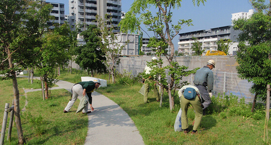 Haseko Corporation performed cleaning activities in the park adjacent to the "worksite of Hama Koshien Phase I 2BL-a Plan (tentative name)" on August 3, 2018, which doubled as activities to contribute to the local community. The cleaning task was performed by a total of approx. 20 people consisting of Haseko Corporation’s employees, our business partners’ employees and construction workers at the worksite. At the worksite, we will put efforts into conducting such activities again in the future, as they contribute to the local community and also help preserve biodiversity.