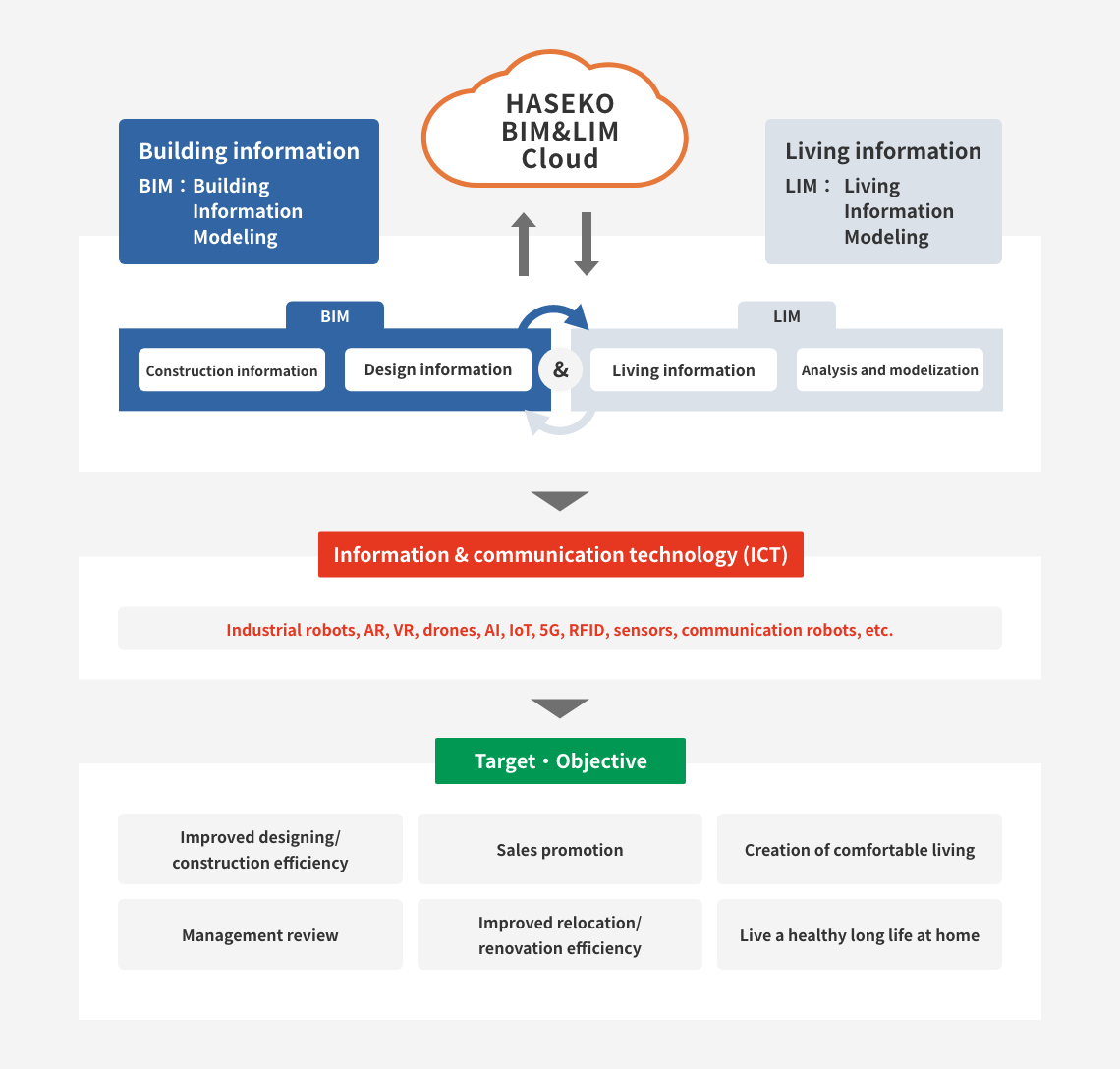 In order to realize safe, secure and comfortable housing and living, the Haseko Group has built the "HASEKO BIM & LIM Cloud," an information platform that accumulates, on its proprietary cloud, Building Information Modeling (BIM) in designing and construction and Living Information Modeling (LIM) including information collected from sensors embedded in condominiums. Going forward, we will continue to promote open innovation by collaborating broadly with various manufacturers, venture companies, universities, and research institutes. We will also seek to develop "ICT condominiums," which utilize both physical and nonphysical information.