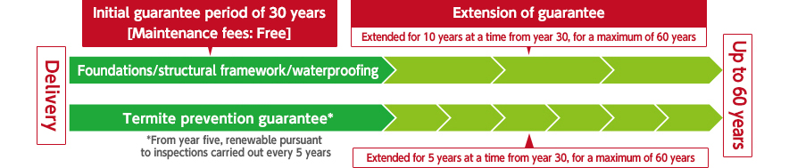 The initial guarantee period for foundations, structural framework, and waterproofing is 30 years. This period may be extended for a further 10 years pursuant to an inspection and paid maintenance works carried out in the 30th year. Thereafter, the guarantee period may be further extended to a maximum of 60 years (in combination with the initial guarantee period) by performing inspections and paid maintenance works every 10 years for foundations, structural framework, and waterproofing, and every 5 years for pest prevention.