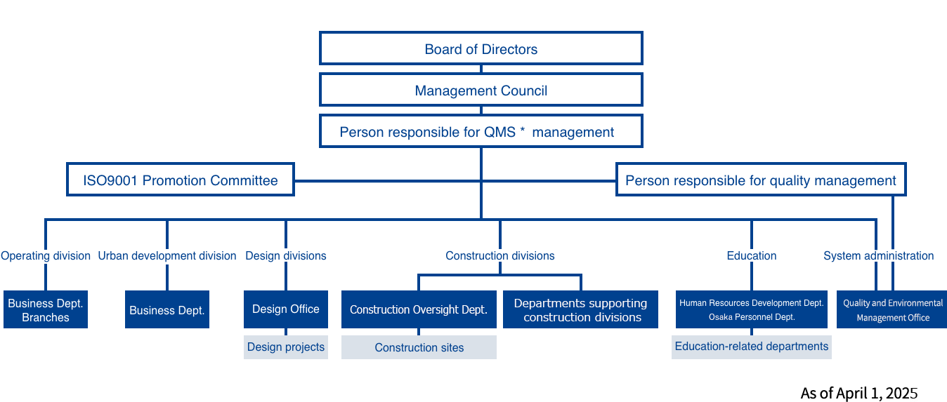 Haseko Corporation obtained ISO9001 quality management system certification in Tokyo and Kansai regions in March 1997 and July 1997, respectively. (In March 2018, we integrated quality management systems of the two regions.) To provide consistent quality, we apply this system to all divisions involved in quality management and enhance customer satisfaction. (Divisions for which certification has been applied as of April 1, 2025: the operating division , the Kansai operating division, the Tokai operating division, the Kansai urban development division, the construction divisions, the Kansai construction division, the design divisions, the Kansai design division)
