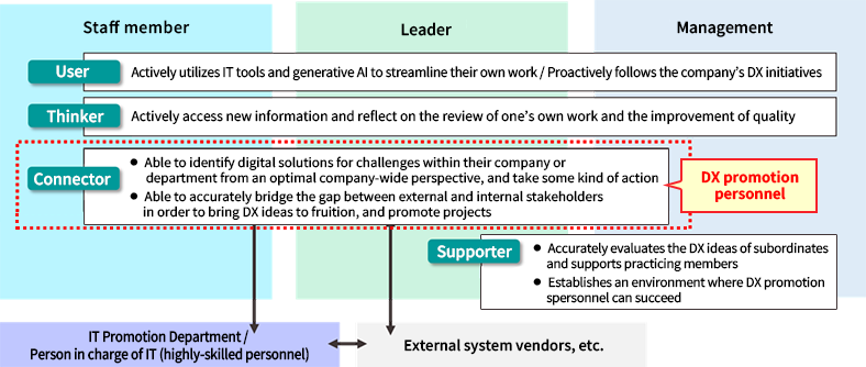 The characteristics of human resources required to manifest DX are divided into three categories. It requires “all employees” to be proactive toward DX, some “highly-skilled personnel” that are knowledgeable, and some “DX promotion personnel” with a drive for transformation. “DX promotion personnel” are individuals who can independently think and act to address challenges faced by their company or group by leveraging digital technology.