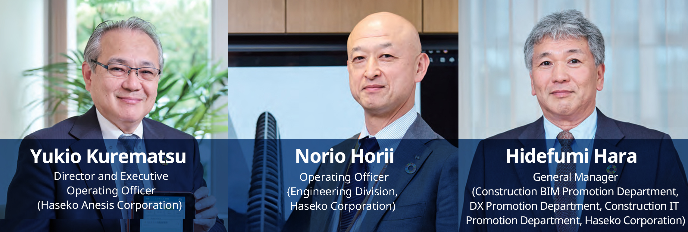 Three key figures who oversee the digital transformation (DX) across Haseko Corporation’s design and construction divisions and service-related business have come together to discuss the issues. Looking back on four years of pursuing the goals set out in Plan NS, they freely discuss what kind of DX the Haseko Group ought to pursue in the future.