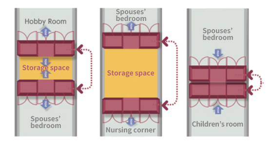 As residents can easily alter the size of the rooms and storage space themselves, even without major renovations, they can flexibly adapt the layout of their homes to accommodate their furniture and items that require storage in response to future changes in family size and lifestyle.