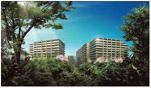 「ライオンズ南千里佐竹台グランハート」は、阪急千里線「南千里」駅より徒歩6分にあり、開発敷地面積は18,000m2超で、吹田市の「千里ニュータウンのまちづくり指針」に基づいて、敷地全体を庭園化し、空地を生かした配棟計画(2棟構成)としています。敷地中央部には約2,750m2の中庭広場を、建物の外周部には敷地を四方に囲む幅員1.8m以上の遊歩道(ソメイヨシノなどの保存樹を生かした桜並木など)を計画するなど、街との親和性に配慮した敷地計画となっています。