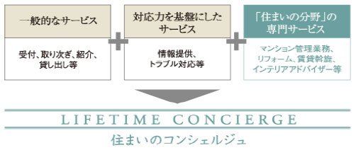共用棟にある「ガーデンビューラウンジ」の一角には、様々なサービスを受けられる「コンシェルジュカウンター」を設置し、コンシェルジュによる良質なサービスを行います。<主なサービス内容>