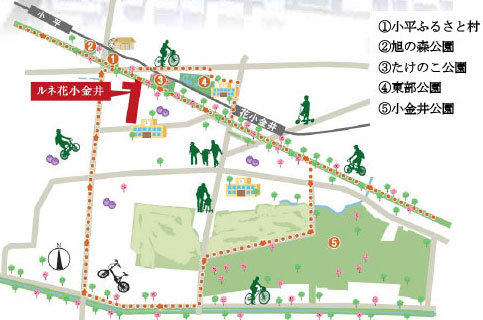 - 桜並木の多摩湖サイクリングロードに近接、周辺には大小さまざまな公園が点在し、緑にふれあいながら子育てのできる住環境。