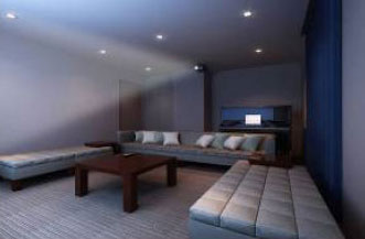 防音仕様の室内に100インチのシアターやアップライトピアノ、通信カラオケを用意。