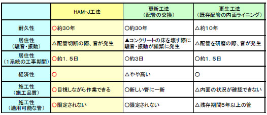 『HAM-J工法』、「更新工法」「更生工法」の比較