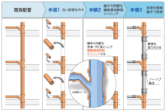 本工法は、既設の排水立て管を新しい管と取り替える「更新工法」と、排水管内面を繊維補強樹脂等でライニングする「更生工法」を組み合わせたオリジナル工法で、居住性・経済性・施工性に優れています。