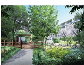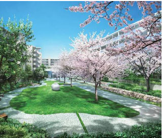 (1)高さ8mのシンボルツリー、(2)桜並木や芝生広場、(3)バルコニー(奥行き約2.5mの大型バルコニー、一部タイプ)。